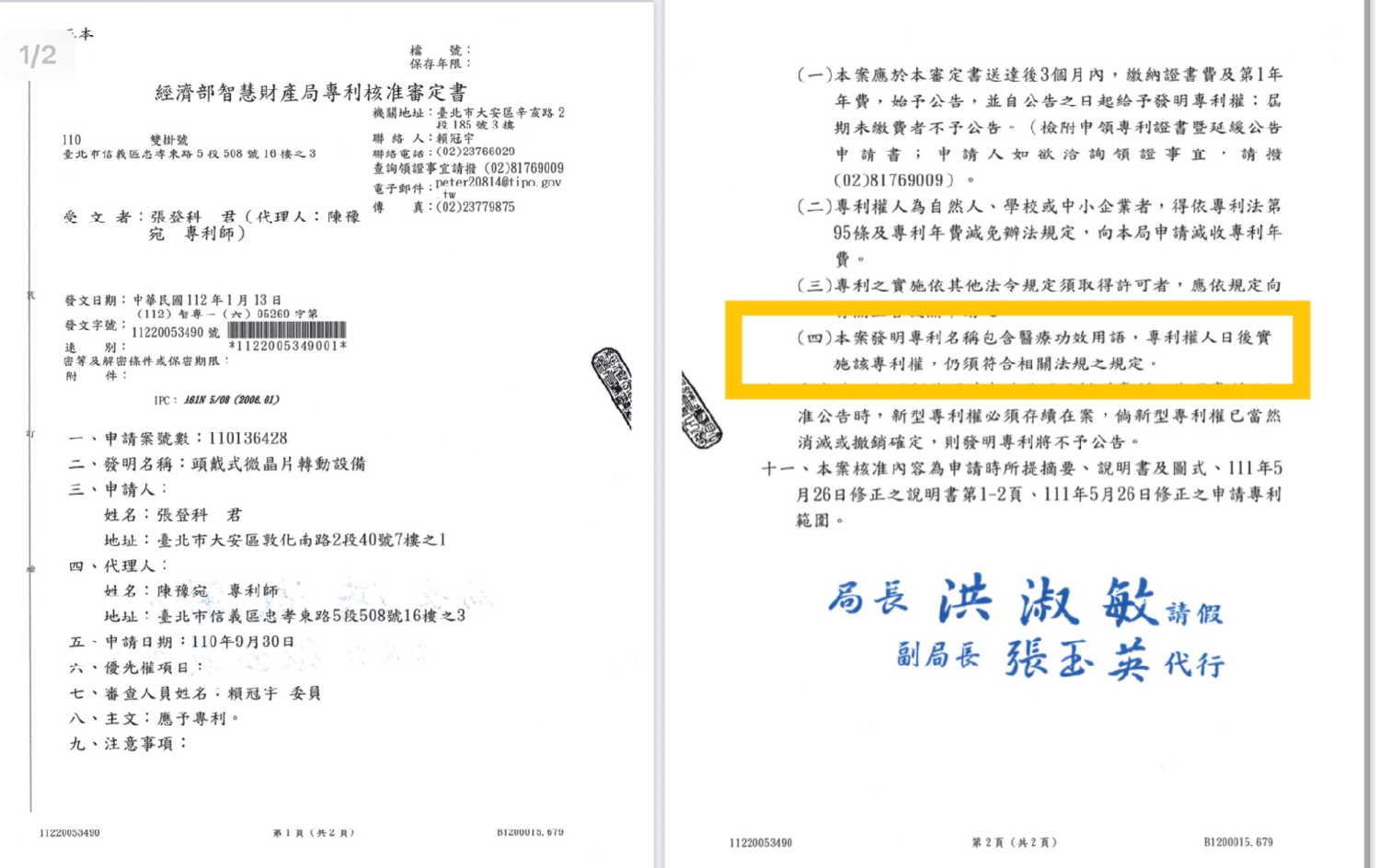 台灣匯芯公司張登科董事長所發明之TRH時光逆齡頭罩獲得經濟部智慧財產局專利審查許可,殊堪榮耀,該專利發明內含醫療效果,可依相關法規實施,為廣大會員新增一保健利器,值得會員夥伴們大力推廣!