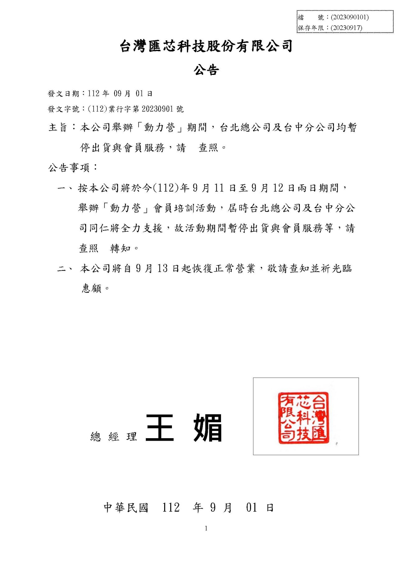 本公司舉辦「動力營」期間,台北總公司及台中分公司均暫 停出貨與會員服務,請查。