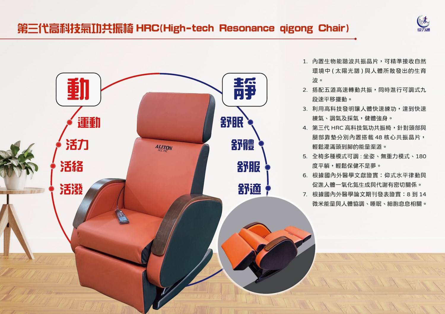 4、第三代HRC高科技氣功共振椅,針對頭部與腿部靠墊分別內置搭載48核心共振晶片,輕鬆灌滿頭到腳的能量渠道。