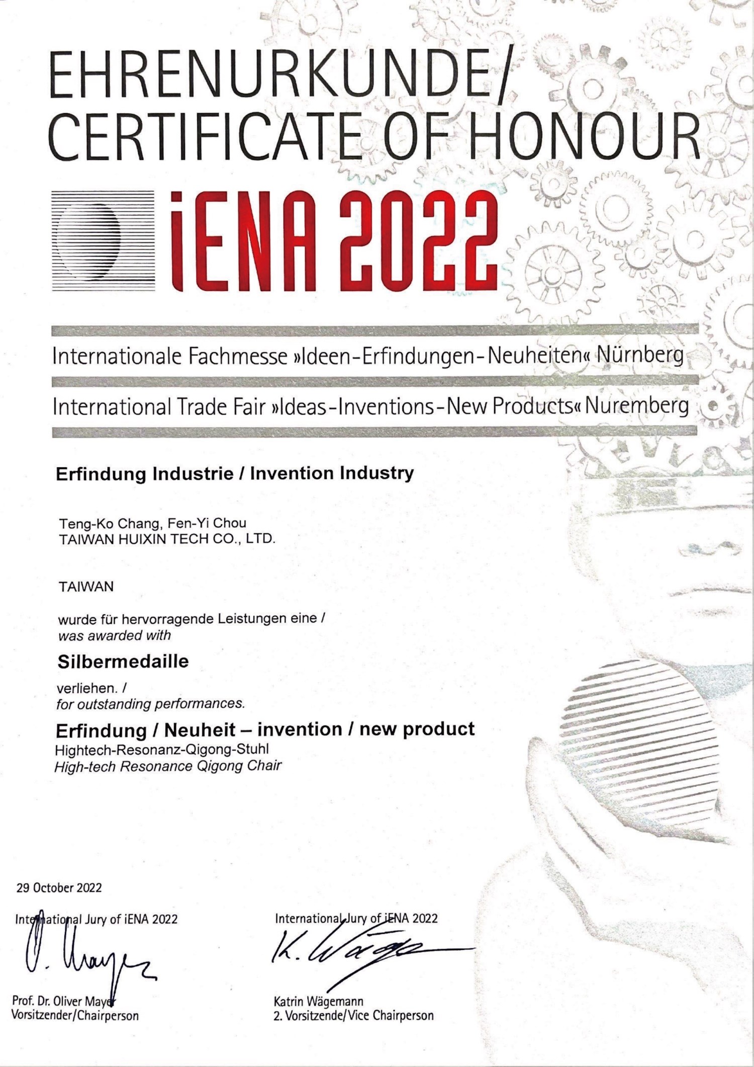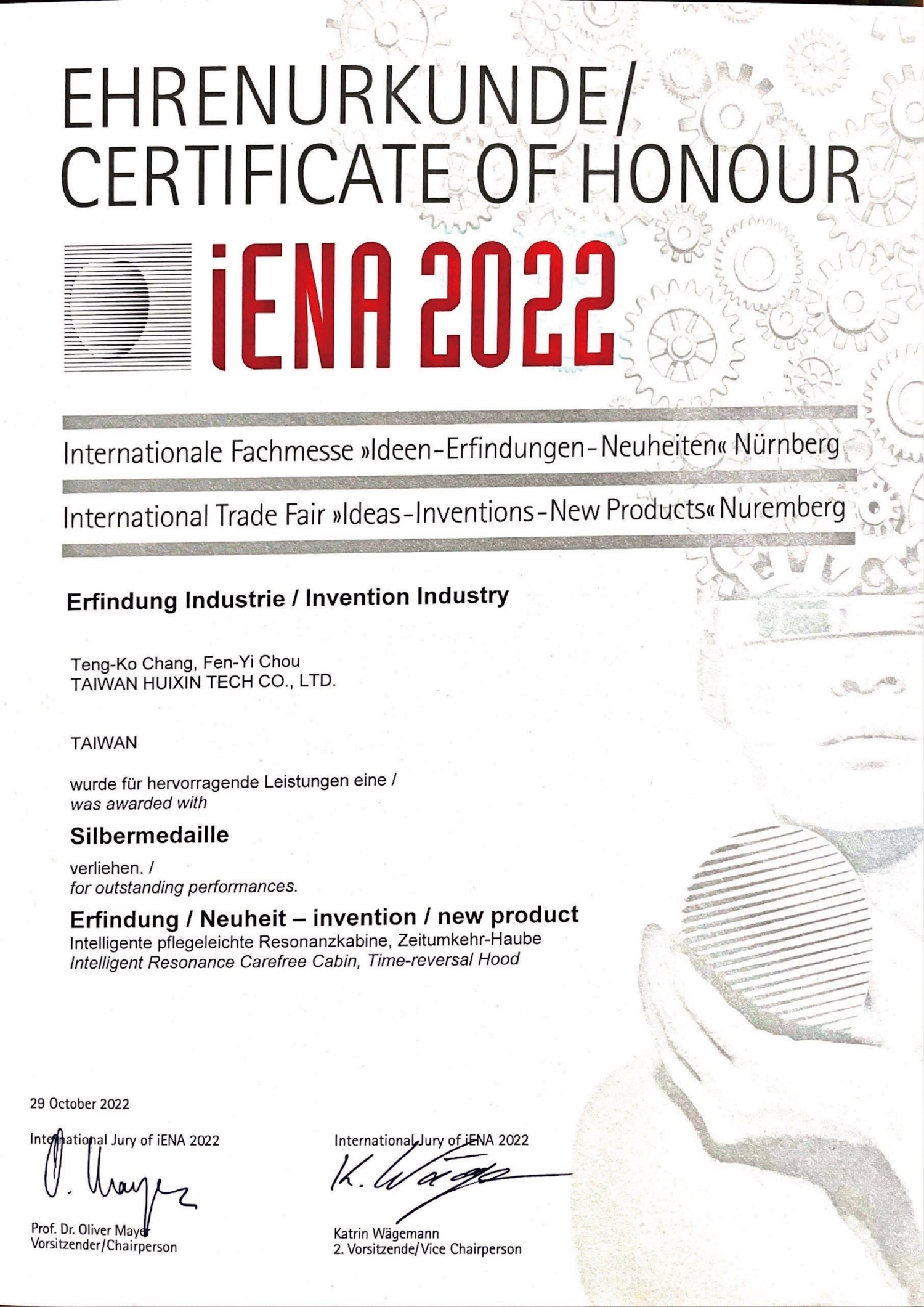 台灣匯芯參加 2022 德國紐倫堡發明展 榮獲iENA 大會 特別獎 及 二面銀牌 肯定