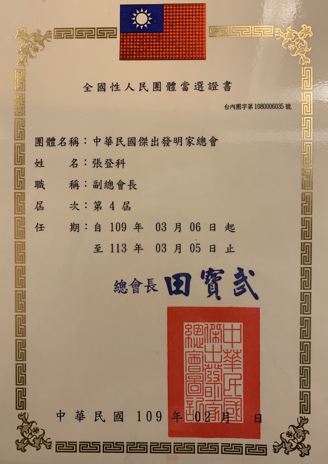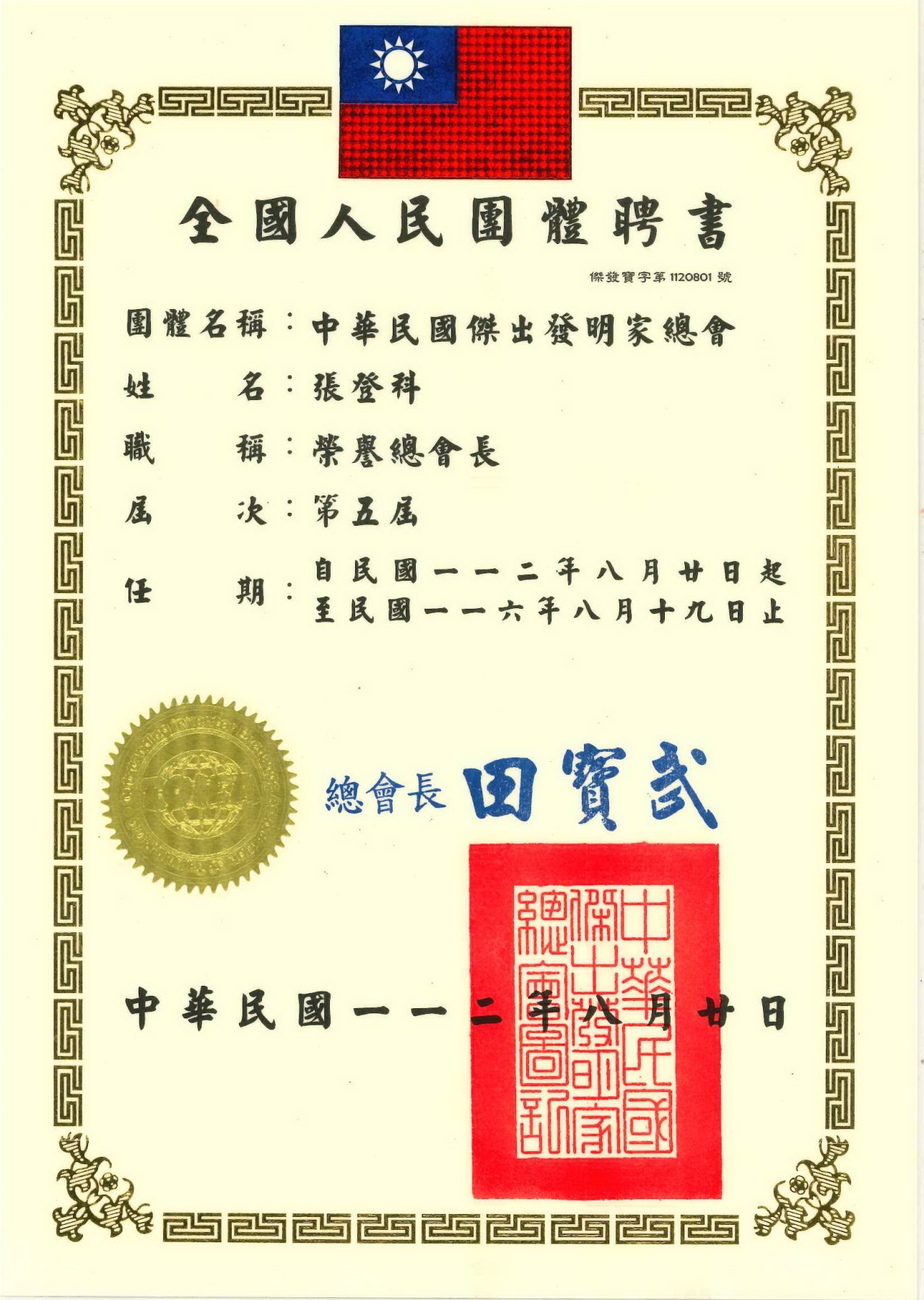 榮譽總會長當選證書