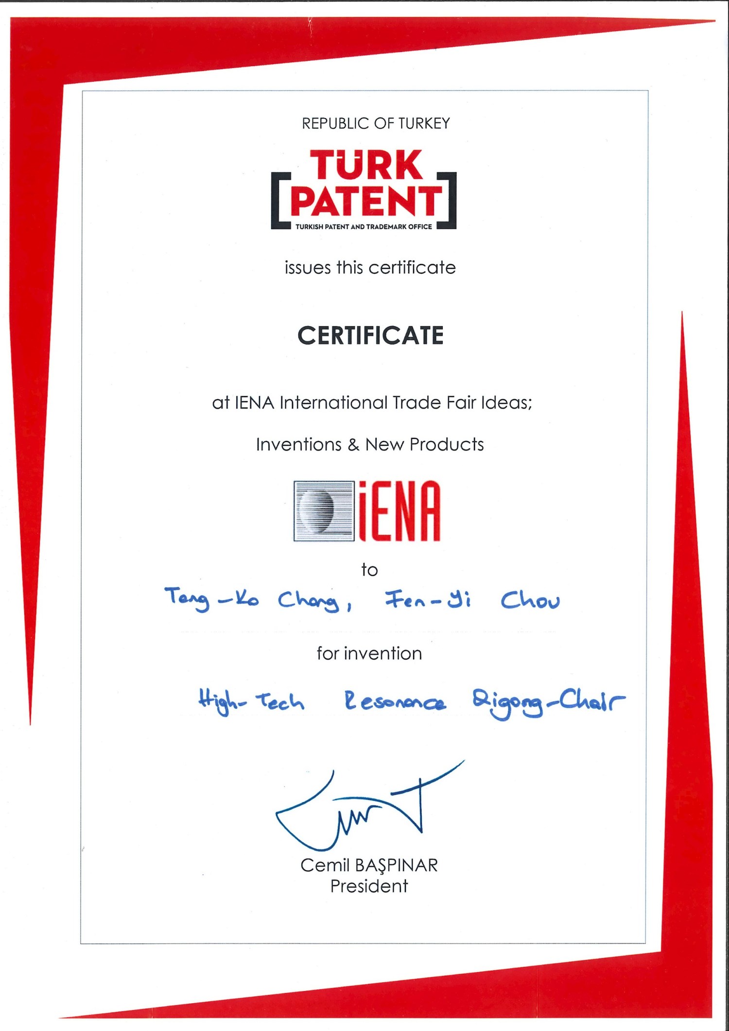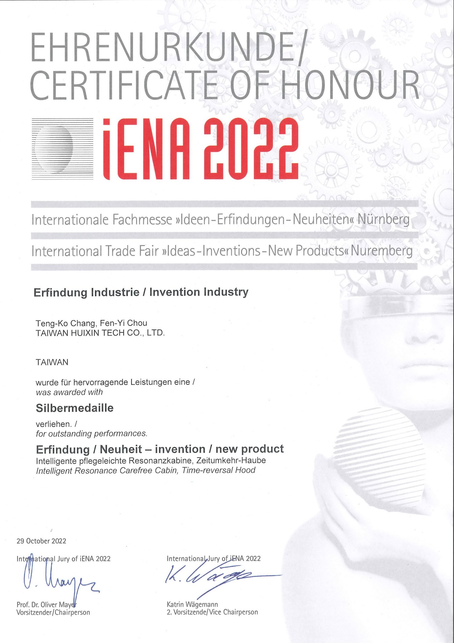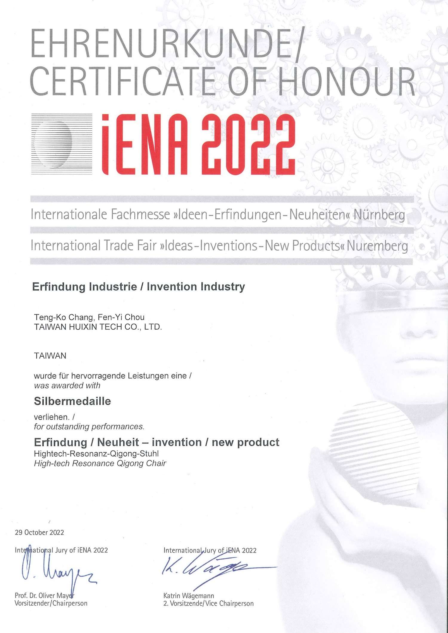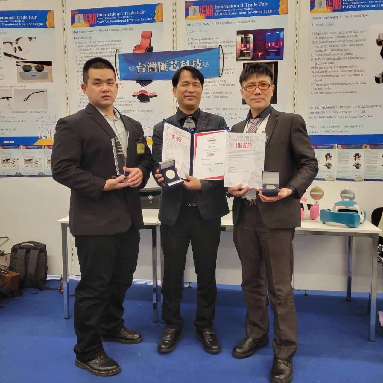 代表團沈毓豪團長表示,全球規模最大歷史最悠久的德國紐倫堡國際發明展 (賽),因其評審最公正,參展者最踴躍,在國際間享有最高之權威聲譽,深獲世界各國政府及教育、學術界肯定。今年台灣代表團成績優異,不僅作品獲得大會特別獎的殊榮,另有 5 金、9 銀、6 銅的佳績,台灣代表團共獲得 21 面獎牌。其中從事能量共振技術相關運用,由台灣十大傑出發明家張登科董事長(發明人)台灣匯芯科技股份有限公司系列產品參賽:「IRC 智能共振舒活艙」、「RTH 逆齡時光頭罩」、「HRC 第三代高科技氣功共振椅」,三件作品都拿下銀牌;其中「HRC 第三代高科技氣功共振椅」還榮獲罕見的德國 iENA 大會特別獎殊榮,可見台灣企業的研發實力不容小覷。